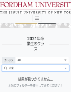 検索してもフォーダム大学の卒業生に小室圭さんの名前がでません。